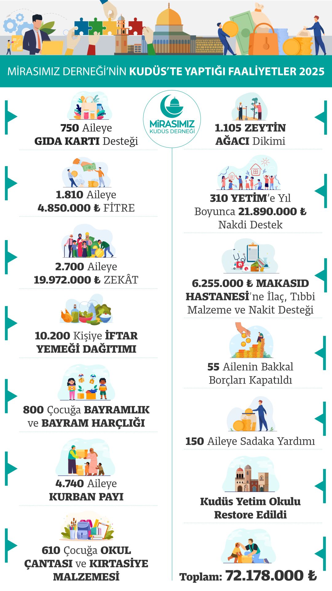 Mirasımız Kudüs Derneği, 2025 yılı içerisinde Kudüs’te yürüttüğü çalışmalarla toplam 72 milyon TL’yi aşan insani yardım ve destek sağladı.