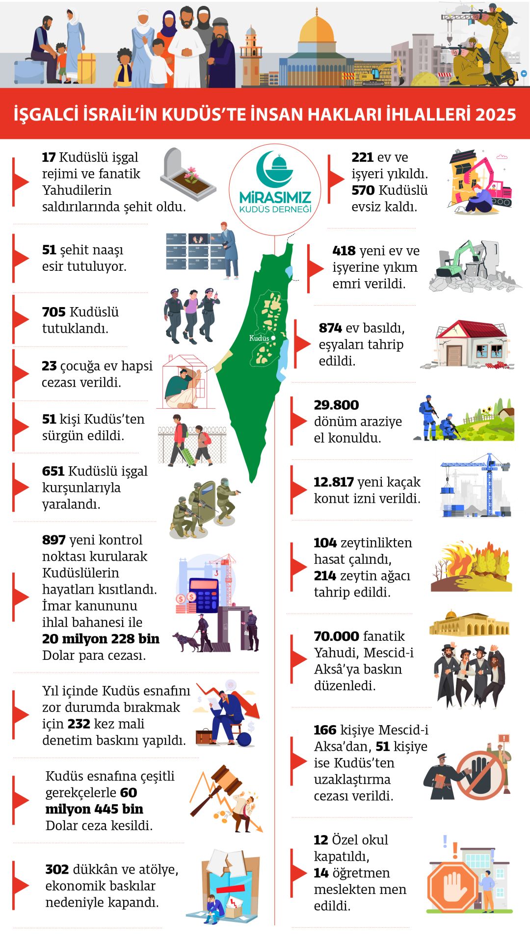 Mirasımız Kudüs Derneği, 2025 yılı boyunca Kudüs’te artan baskılara rağmen insani yardım ve sosyal destek çalışmalarını sürdürdü. Bu kapsamda binlerce aileye gıda, fitre ve zekât desteği sağlanırken, Ramazan ve Kurban dönemlerinde on binlerce kişiye ulaşıldı.